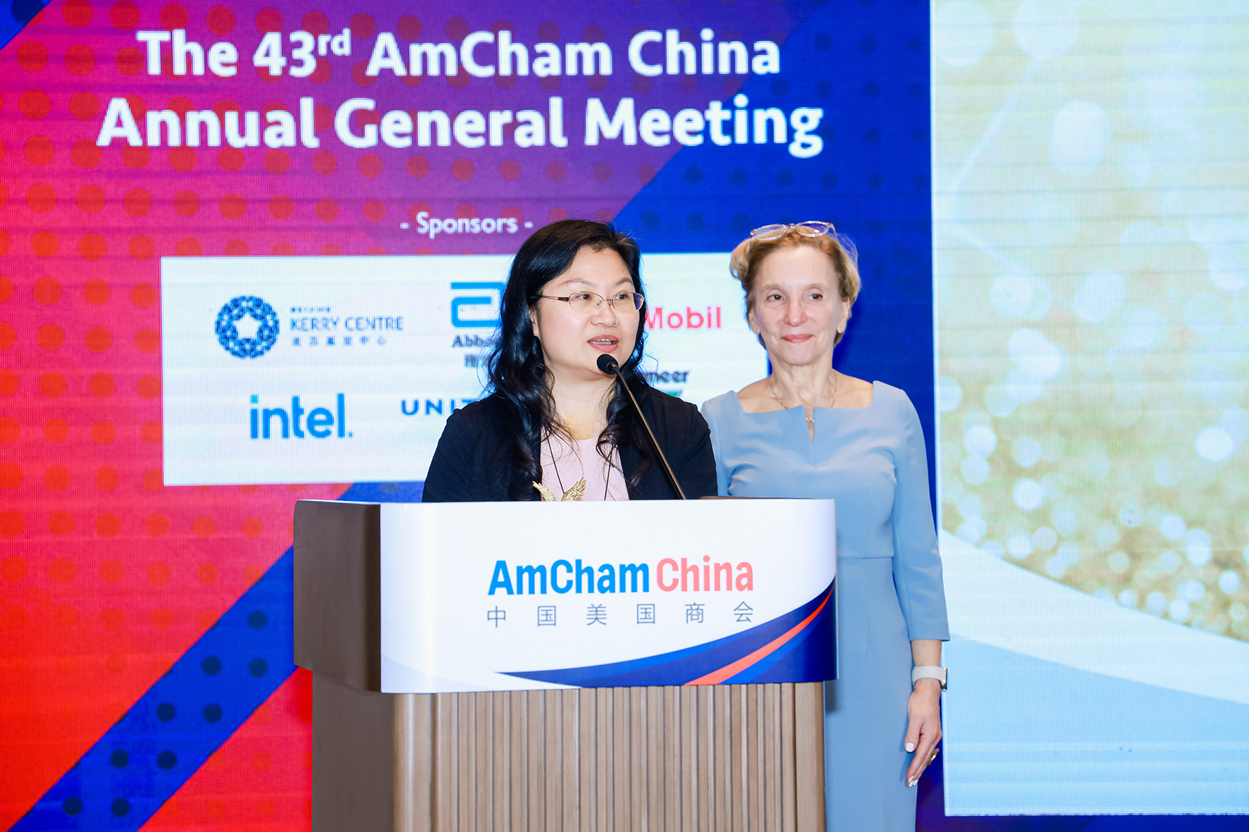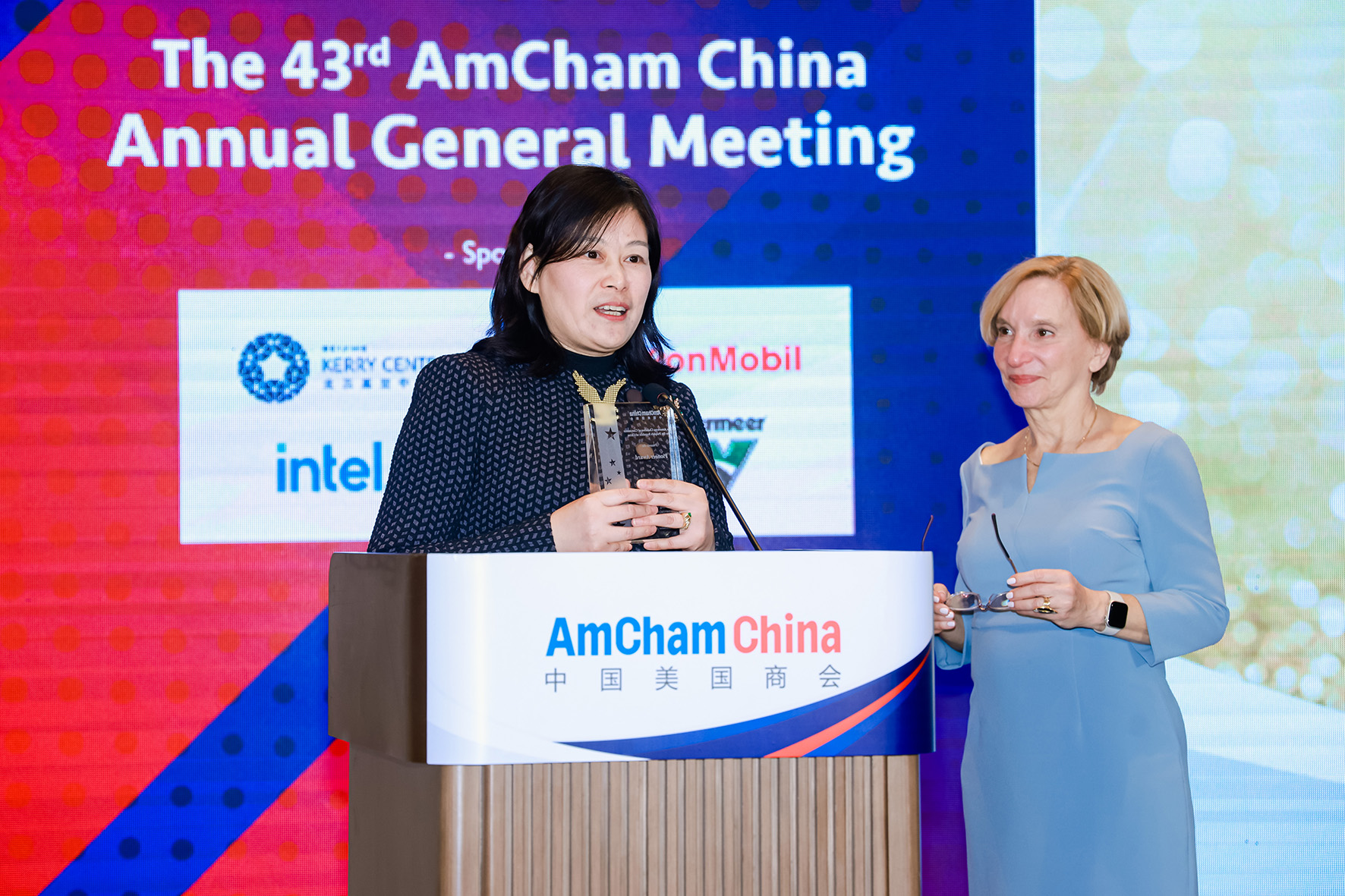 Gloria Xu (left) accepts the 2024 Pioneer Award from AmCham China Chair Roberta Lipson