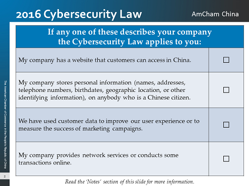 AmCham China has prepared "Stealable Slides" on the 2016 Cybersecurity Law. Click here to download the slides. For background information, read our article about the 2016 Cybersecurity Law.