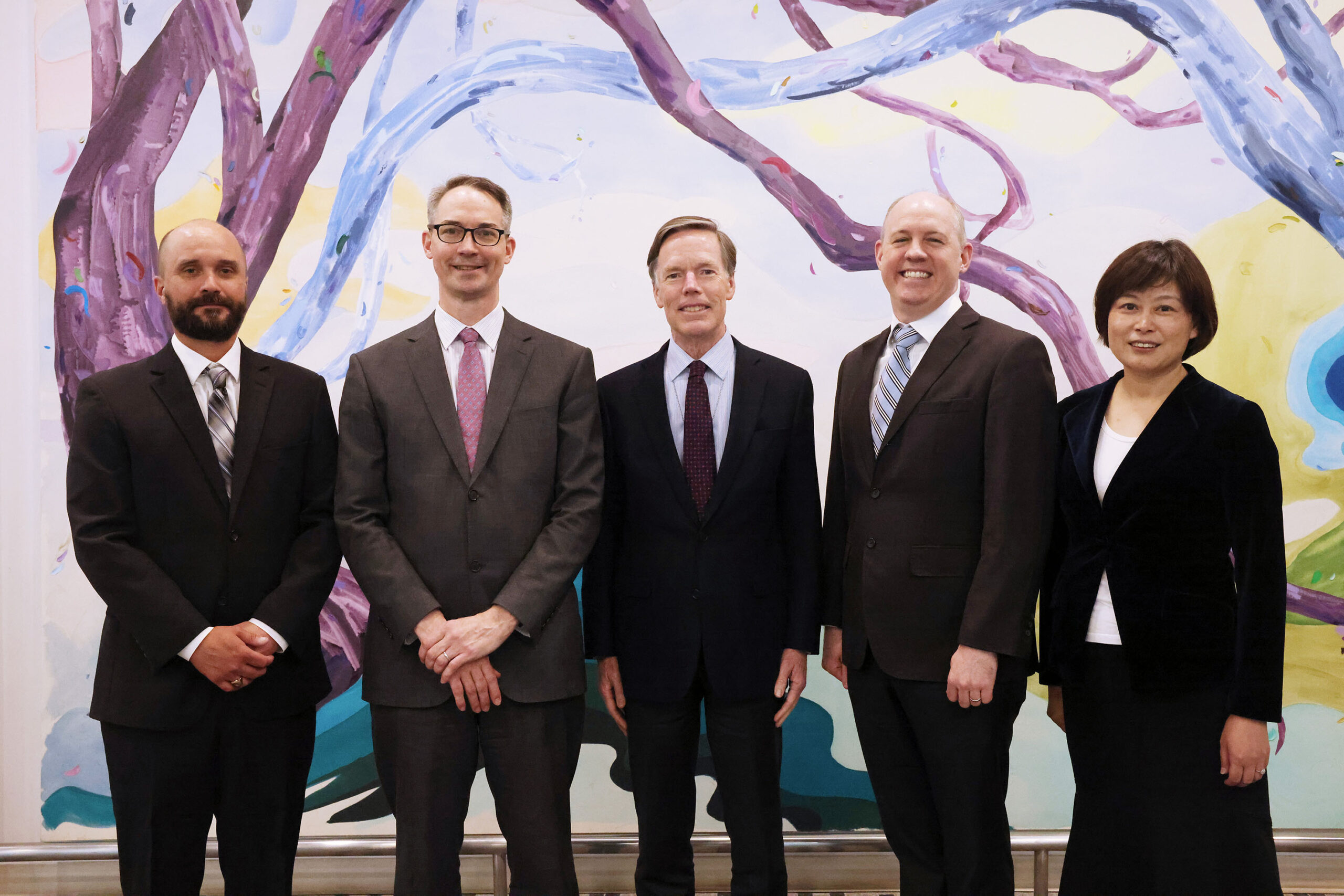 Ambassador Burns meets with AmCham China’s leadership. From left to right: Vice Chair Brent Young, President Michael Hart, Ambassador Burns, Chairman Colm Rafferty, Vice Chair Gloria Xu