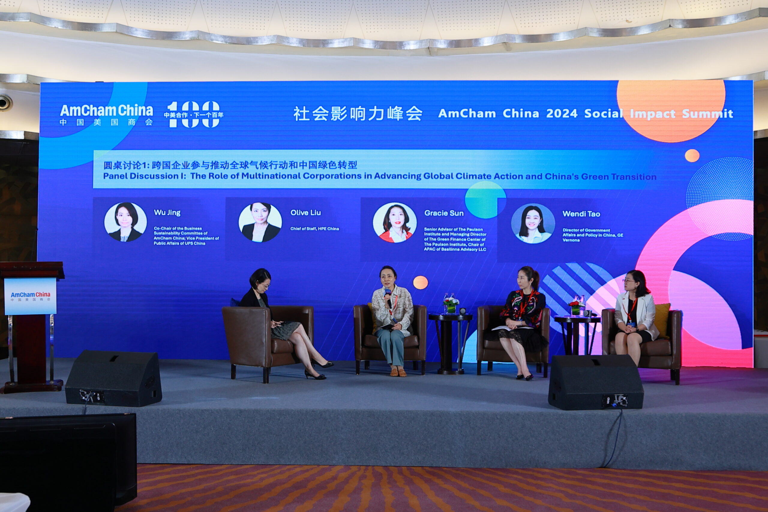The first panel, titled “The Role of Multinational Corporations in Advancing Global Climate Action and China’s Green Transition,” was moderated by Wu Jing, Vice President of Public Affairs at UPS China and Co-Chair of AmCham China’s Business Sustainability Committee. Panelists included Olive Liu, Chief of Staff at Hewlett Packard Enterprise (HPE) China; Gracie Sun, Senior Advisor at the Paulson Institute, Managing Director of the Institute’s Green Finance Center, and Chair for APAC at Basilinna Advisory LLC; and Wendi Tao, Director of Government Affairs and Policy in China at GE Vernova China. The discussion emphasized how multinational corporations utilize technology and sustainable practices to advance climate action and support China’s green transition.